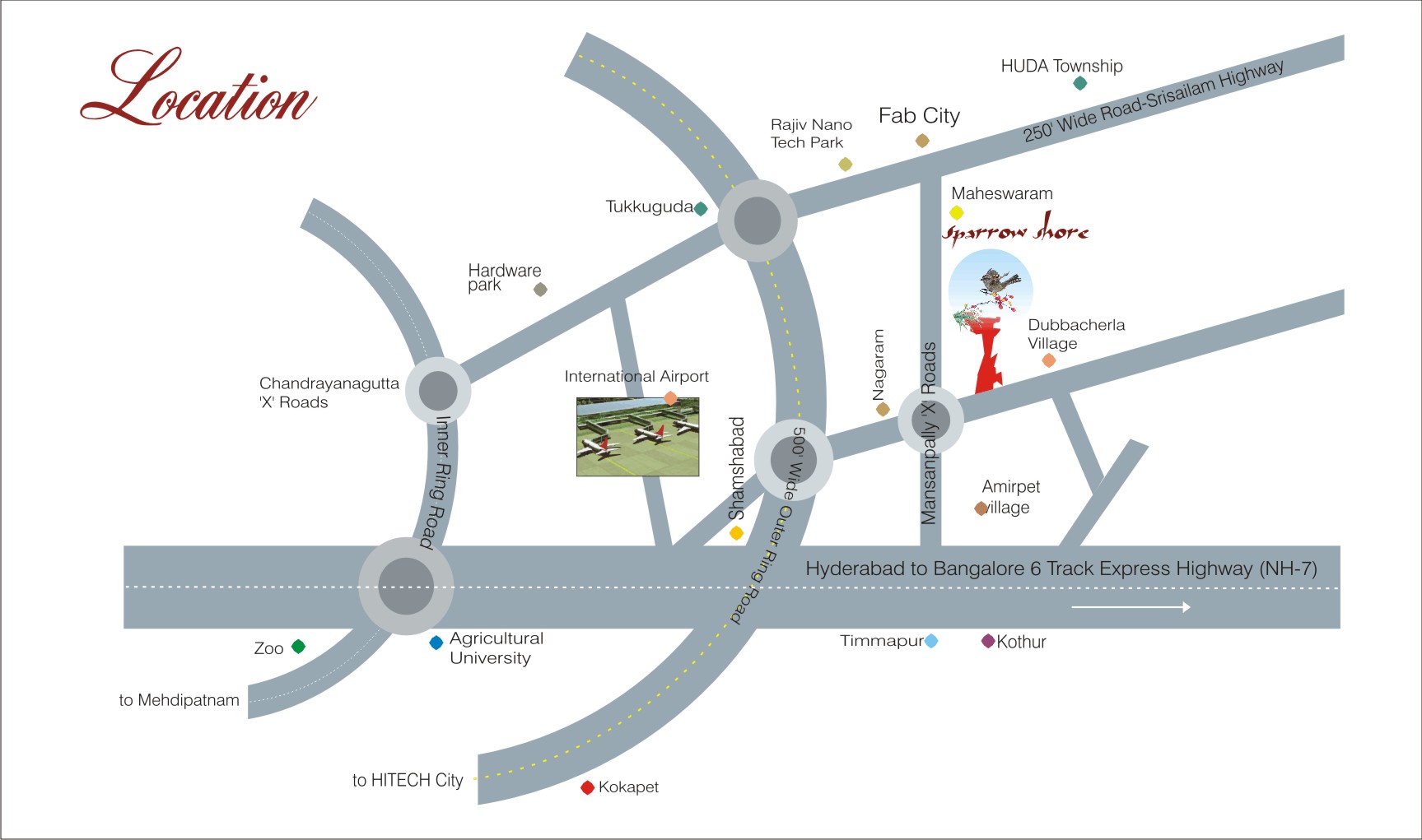 True to its name, tranquility dwells in the environs of Sparrow Shore. Set amidst lush greenery, this unique project offers serenity within the reach of modern development. These HMDA approved layouts are located in Dubbacherla Village, Maheshwaram Mandal, RR District. This ecologically viable location is just 15 minutes from the new Rajiv Gandhi International Airport and within easy reach from Outer Ring Road.